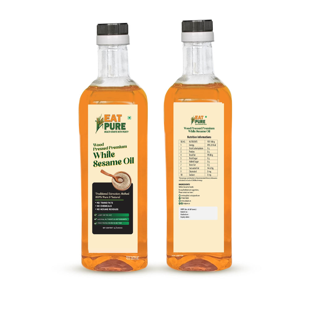 Discover the rich, nutty flavor and exceptional health benefits of our premium wood pressed white sesame oil. Extracted using traditional wooden press(Lakdi ghani) methods where the seeds are crushed between two wooden surfaces under 30°C temperature, our sesame oil retains all the essential nutrients, natural aroma, and authentic taste that make it a valuable addition to your kitchen and wellness routine. Pure, natural, and free from additives, our wood pressed white sesame oil is perfect for culinary and therapeutic uses. Our sesame oil is made from the finest, organically grown white sesame seeds, ensuring a product that delivers superior quality and purity. Whether you’re enhancing your dishes or nourishing your skin and hair, our wood pressed white sesame oil offers unparalleled benefits. White sesame oil is strongly endorsed by Ayurveda, Siddha and Unani for usage like medicine, cuisines and rituals..